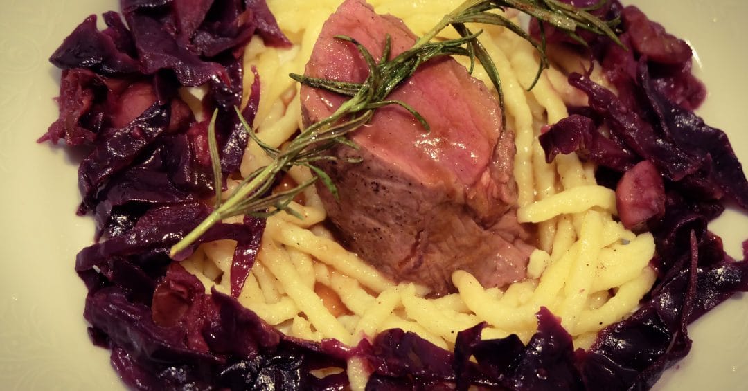 Rehrücken mit Apfel-Maronen-Kohl und Spätzle