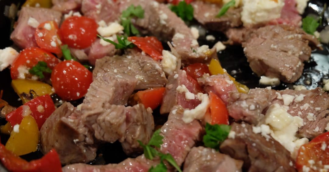 Rinderfilet Streifen mit Paprika, Feta und Kirschtomaten